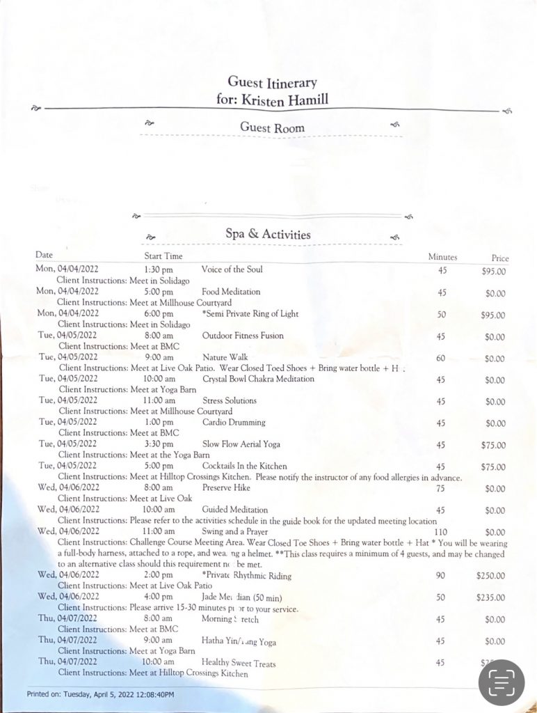 I built my schedule to be focused on meditation and stress reduction. In contrast, my friend chose outdoorsy activities such as a ropes course, a 45-foot climbing tower, healthy snacks preparation, and steak grilling.